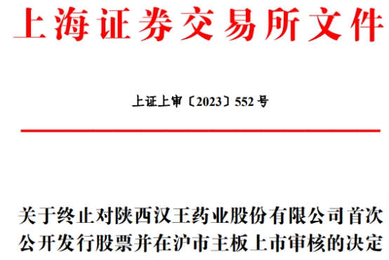 上交所于2023年3月3日依法受理了汉王药业首次公开发行股票并在沪市主板上市的申请文件,并按照规定进行了审核。2023年7月14日,汉王药业的保荐人兴业证券股份有限公司向上交所提交了《关于撤回陕西汉王药业股份有限公司首次公开发行股票并在主板上市申请文件的申请》(兴证投〔2023〕41 号),申请撤销陕西汉王药业股份有限公司首次公开发行股票并在沪市主板上市保荐工作。根据《上海证券交易所股票发行上市审核规则》第六十三条的有关规定,上交所决定终止对汉王药业首次公开发行股票并在沪市主板上市的审核。