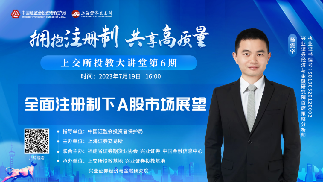 活动中,兴业证券经济与金融研究院首席策略分析师杨震宇为投资者讲授《全面注册制下A股市场展望》。讲师从全面注册制的背景、改革目标、资本市场各板块IPO标准及发行情况入手,为投资者详细介绍全面注册制的核心内容,并从打新策略、企业估值、市场结构等方面综合分析注册制改革对投资者的影响。最后,讲师为投资者分享了全面注册制时代的投资逻辑与投资策略,引导投资者理性参与市场投资。