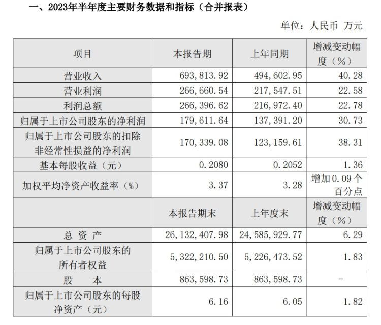 公告称,2023年上半年,国民经济持续恢复、总体回升向好,金融市场供给侧结构性改革持续深化,全面实行股票发行注册制成功落地,证券行业高质量发展稳步推进。公司全力推动双轮联动和数智化建设,加快推进自有资金投资交易业务“三增三降”综合化转型,三大业务高质量发展水平进一步提升。