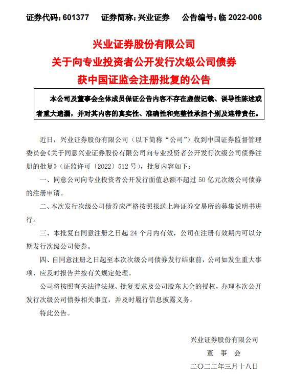 经上海证券交易所审核同意,证监会审核,2022年3月,证监会下发证监许可〔2022〕512 号)批文,同意兴业证券向专业投资者发行总额不超过50亿元的次级公司债,有效期24个月。