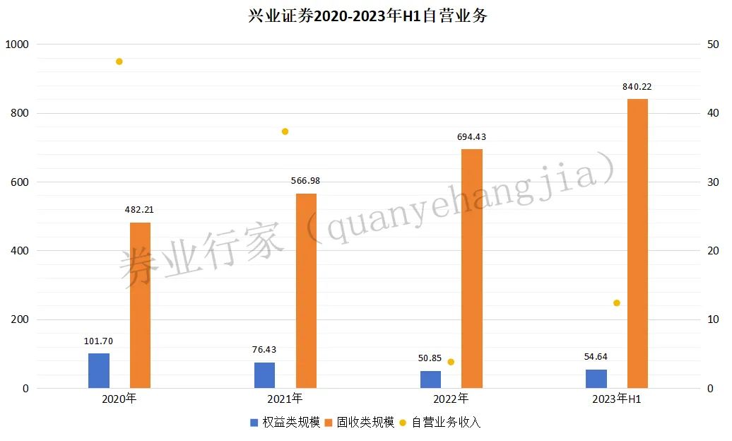 值得注意的是,从2020年到2023年上半年,兴业证券净资产明显增长,而固收规模的增速更为可观:2022年上半年固收类规模约为840.22亿元,几乎是2020年的两倍;而权益类规模则从2020年的101.70亿元一路缩水至54.64亿元。