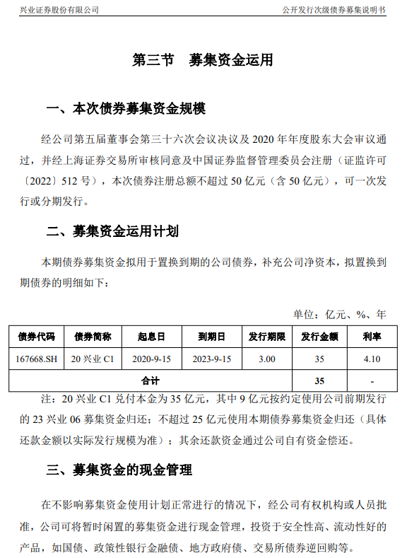 兴业证券表示,“20兴业C1”兑付本金为35亿元,其中9亿元按约定使用前期发行的“23兴业06”募集资金归还;不超过25亿元使用本期债券募集资金归还;其余还款资金通过公司自有资金偿还。