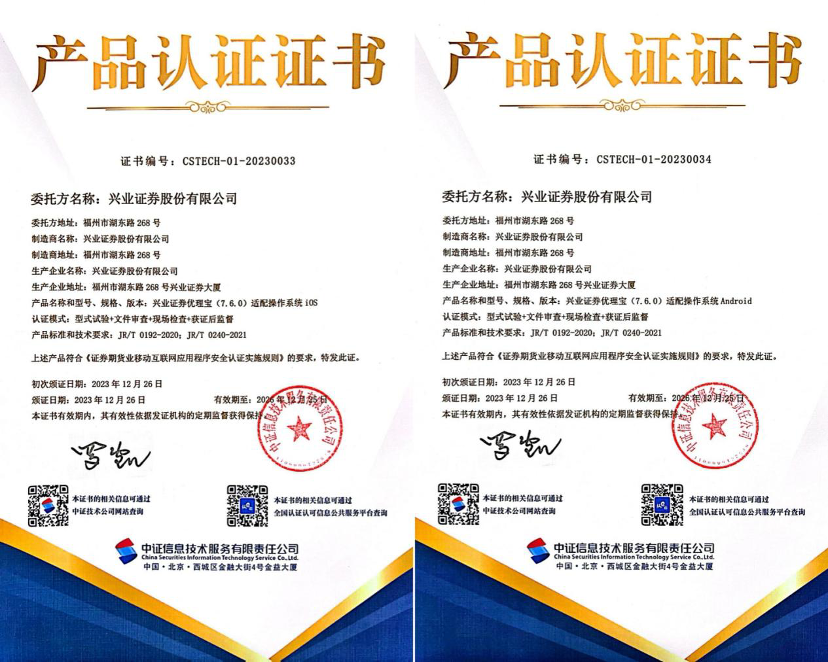 此次通过证券期货业App安全认证标志着优理宝App各项安全能力已达到行业认证标准要求,展望未来,兴业证券将再接再厉,不断巩固完善移动App研发全生命周期的安全防护和隐私合规能力,持续保障客户的交易安全和个人信息安全。
