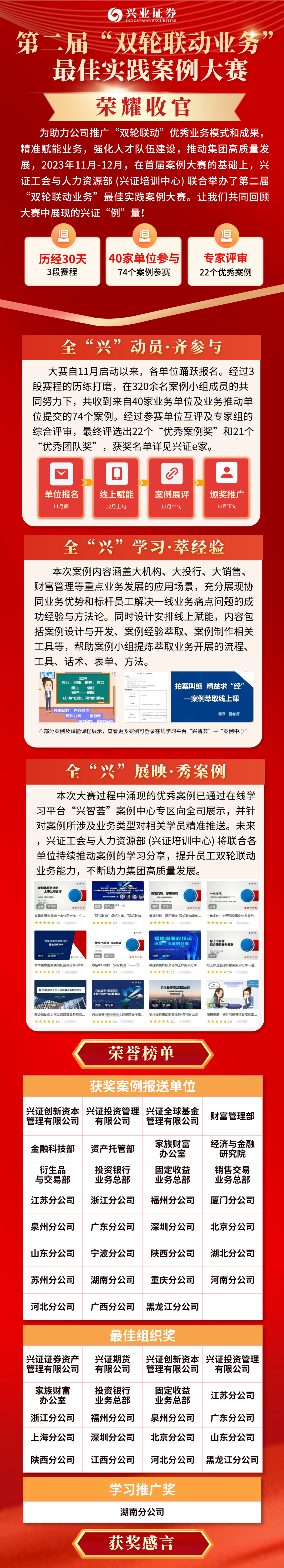 ●本次参赛的“福建省内股权业务协同”等多个典型案例,回顾了兴证投资在提升福建省内投资占比、服务省内实体经济所做的努力以及与分公司实现双赢的过程,希望案例能为集团的双轮联动提供更多的实践模式和经验方法。