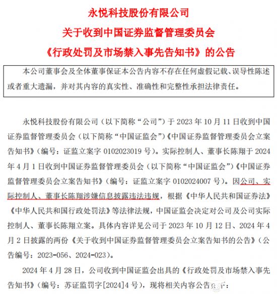 4月28日,永悦科技公告称收到证监会《行政处罚及市场禁入事先告知书》,文件显示,永悦科技涉嫌2022、2023定期报告存在6630.7万元重大遗漏等违法行为,证监会拟对其警告并罚款1300万元,相关时任高管拟被警告并合计罚款1220万元。