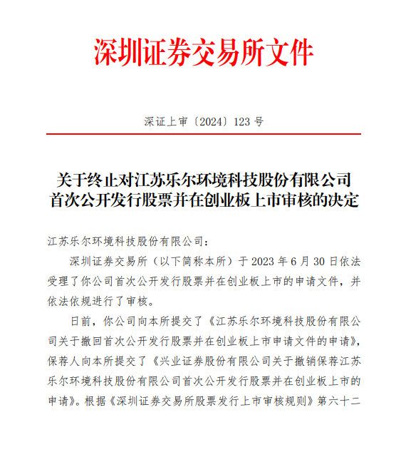 5月28日,深交所决定终止对江苏乐尔环境科技股份有限公司(以下简称“乐尔股份”)首次公开发行股票并在创业板上市审核,保荐机构为兴业证券股份有限公司,保荐代表人为李圣莹,张衡。