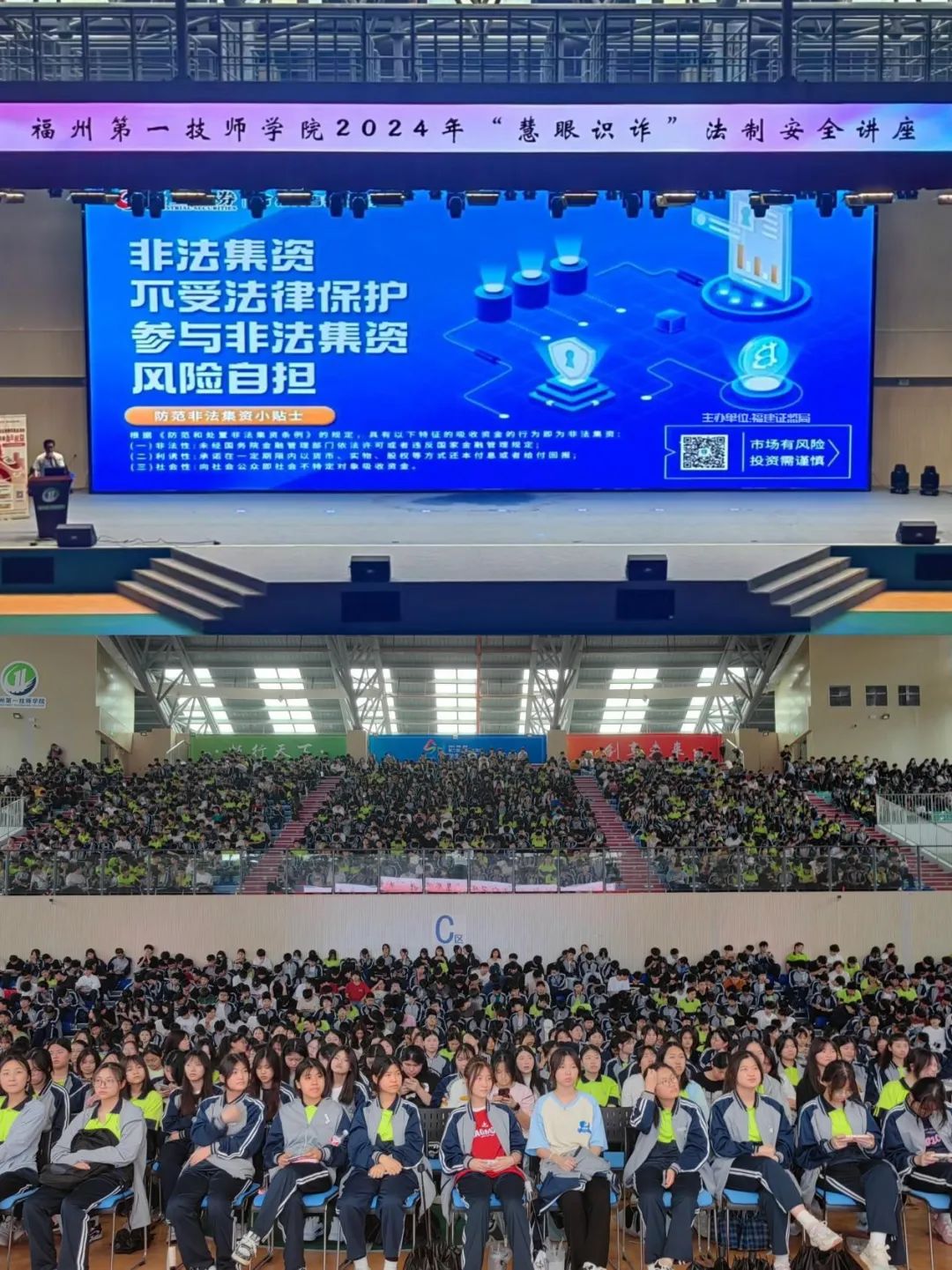 为构筑校园内防范非法金融安全防线,在福建证监局的指导下,兴业证券投教基地走进福州第一技师学院,面向1000余名同学开展“反诈识诈''兴''旅程护航学子防非行”主题投教活动。通过深入剖析金融诈骗套路,还原真实案例,讲师向学生详细介绍如何识别生活中的非法金融行为,帮助在校学生提升安全意识,远离非法金融活动,筑牢防非安全“防火墙”。
