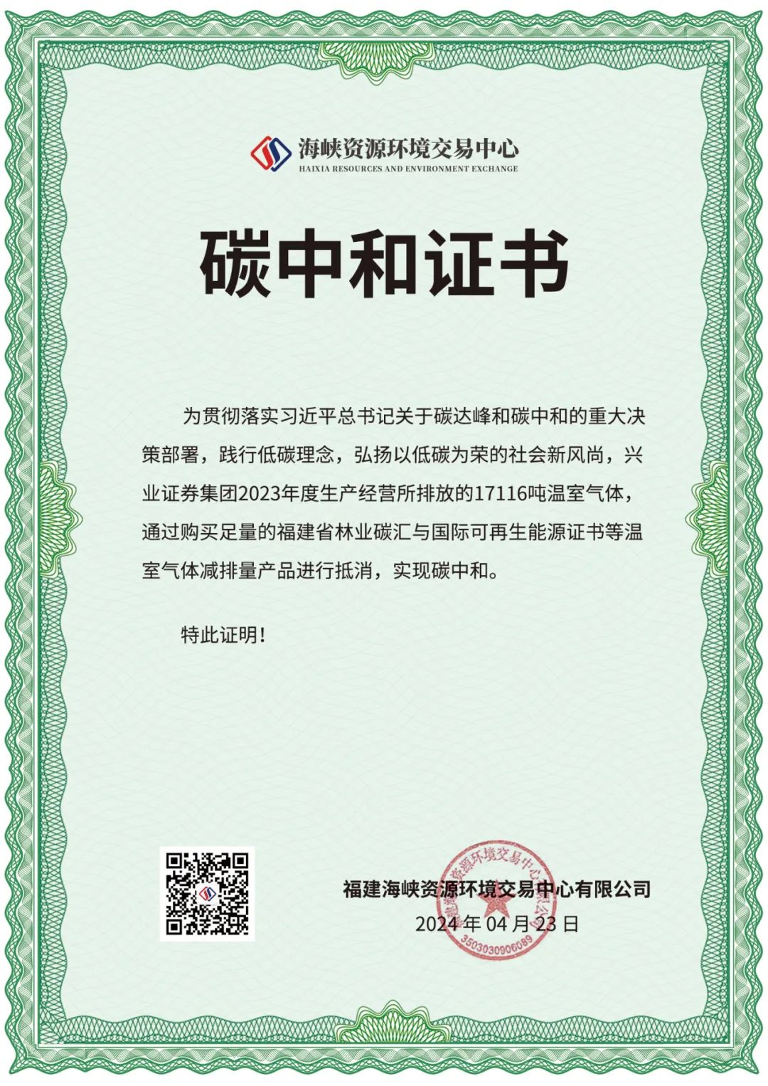 在自身低碳运营方面,公司在《兴证集团2021年环境信息披露报告》中率先提出于“2022年实现自身运营碳中和”目标,制定了切实可行的减排路径规划,出台了《兴业证券低碳运营行动方案》,在内部倡导低碳环保的经营和工作方式,并通过自愿推进减排项目来抵消自身运营产生的碳排放,连续两年实现温室气体净零排放,成为行业首家实现碳中和的证券金融集团。