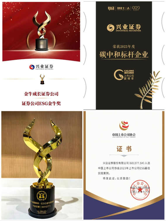 凭借近年来在绿色金融领域的持续贡献,2023年兴业证券揽获多项权威性大奖,包括再次入选中国上市公司协会“上市公司ESG最佳实践案例榜单”,获评中国证券报“证券行业 ESG 金牛奖”,入选“第一届国新杯·中证ESG金牛”百强企业,荣获《财经》杂志2023 年度“碳中和标杆企业”。