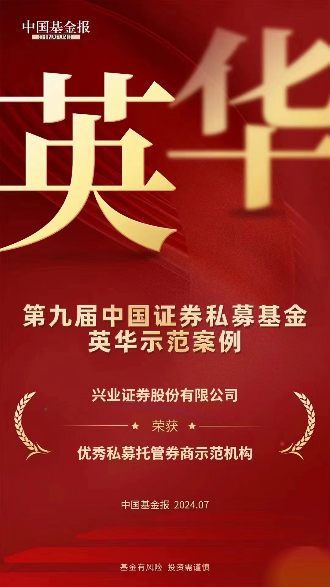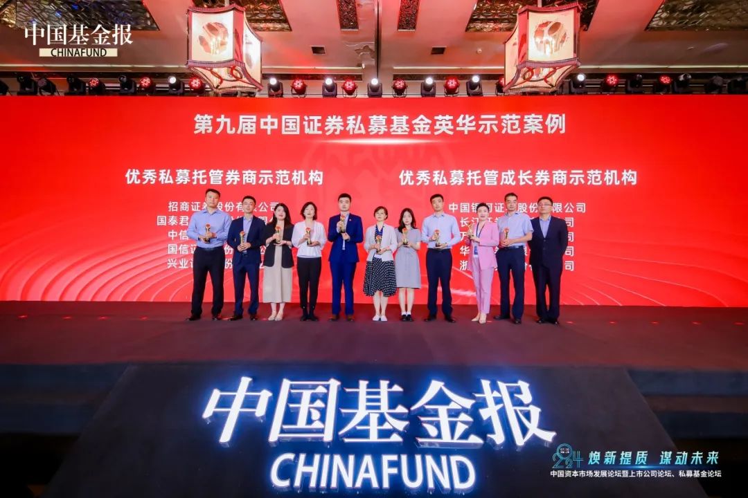 7月10日,由中国基金报主办的第九届中国私募基金英华奖评选结果隆重揭晓,兴业证券再次荣膺“优秀私募托管券商示范机构”奖,充分体现了市场对兴业证券资产托管与基金服务品牌的认可。