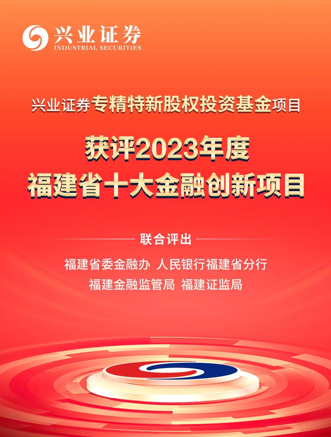 2024年7月9日,2023年度福建省金融创新项目名单正式出炉,兴业证券“专精特新股权投资基金”项目凭借其对福建省民营中小企业高质量发展、高效对接资本市场的有力支持,以及领先的金融创新性成功获评2023年度福建省十大金融创新项目。