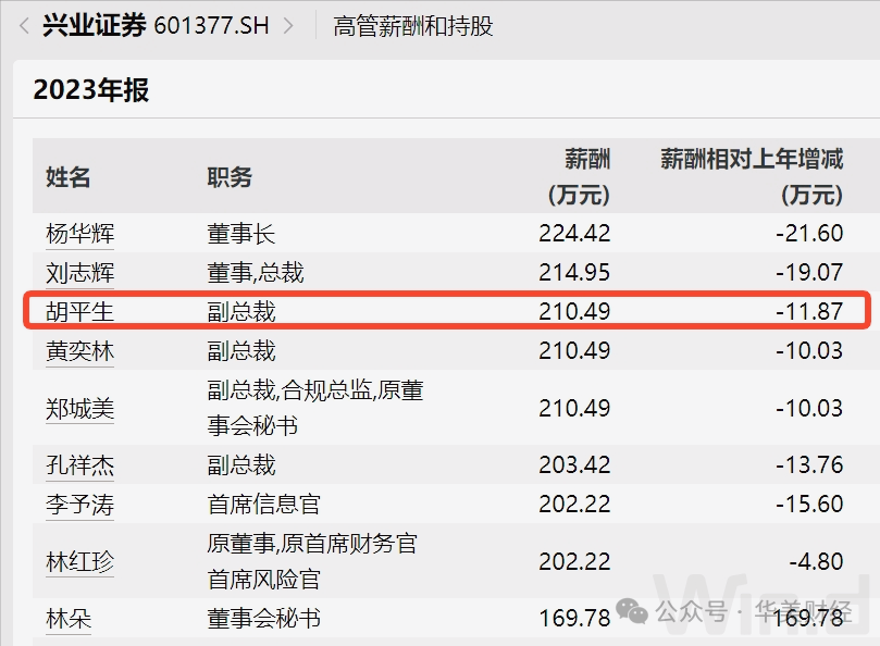 根据财报披露,胡平生去年薪酬和多位副总裁一样,都是210.49万元,比2022年减少10-12万元。兴业证券多数高层去年薪酬都超过200万元,且都有不同程度的减薪。