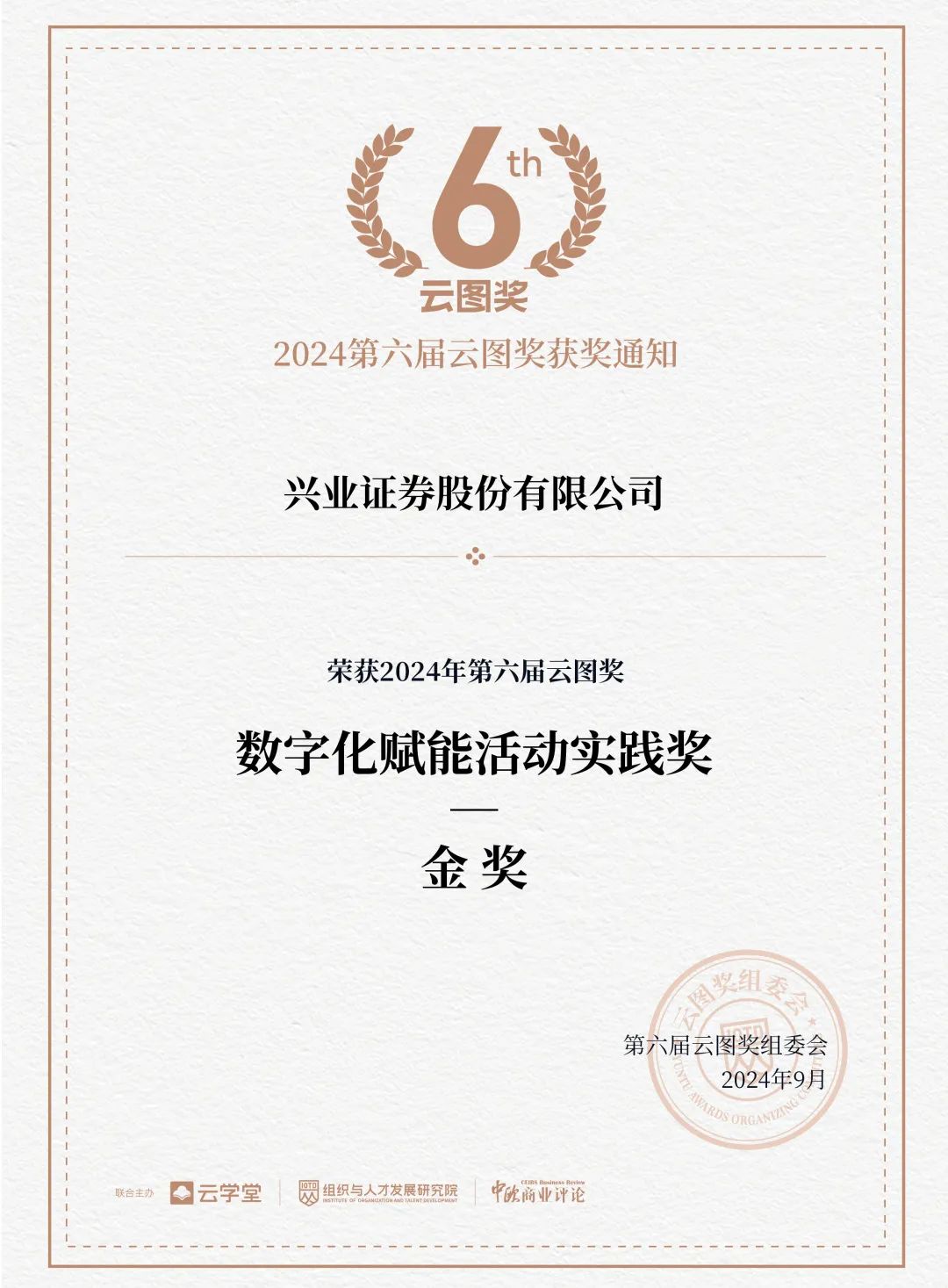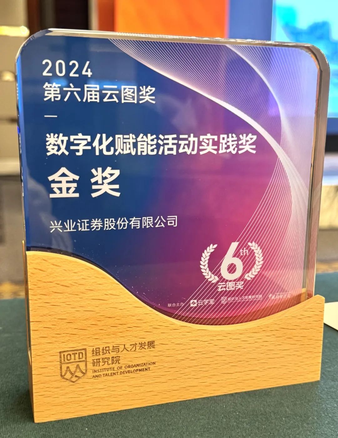 云图奖自2019年创办以来,始终密切关注数字化转型浪潮中组织人才学习领域的创新者和引领者,致力于萃取优秀标杆案例,为中国企业数字化学习及组织变革之路提供新思路和新航标。本次“数字化赋能活动实践奖”获奖,不仅是兴业证券在数字化学习领域组织活动运营精准化、多样化的集中体现,也是对兴业证券长期以来在组织人才发展、集团一体化数字培训平台建设等方面努力的充分肯定。