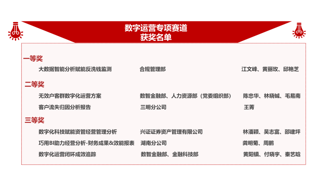 12月5日,兴业证券工会、兴业证券团委、人力资源部(兴证培训中心)、金融科技部联合举办的集团第三届数字化人才培训暨技能应用大赛顺利闭幕,公司首席信息官李予涛,董事会秘书、工会主席林朵出席闭幕式。