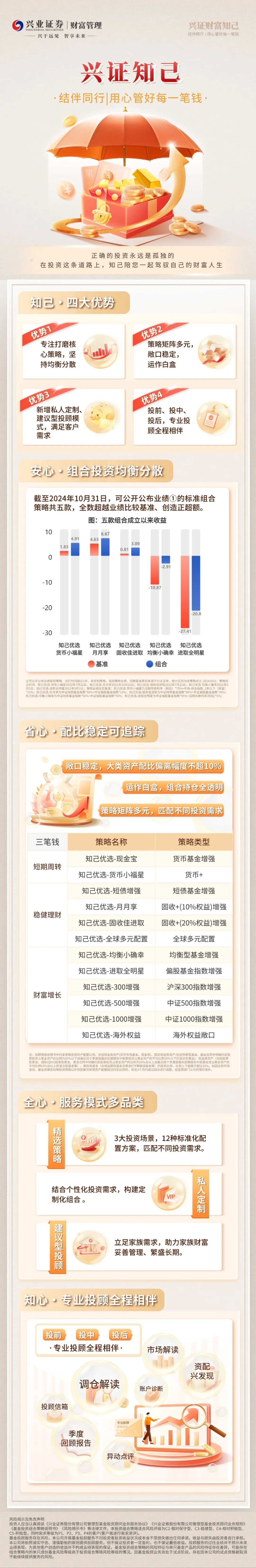 立足多元资产配置,兴业证券基金投顾团队面向不同风险偏好与主流投资场景,提供12种标准化配置方案。2024年,兴业证券在基金投顾服务形态上再获突破,在对客服务终端(优理宝APP)上线全账户诊断服务,打造基金投顾从投前资产诊断、资产配置到投后的账户持续调优的全链路闭环,力争持续提升客户的基金投资获得感。