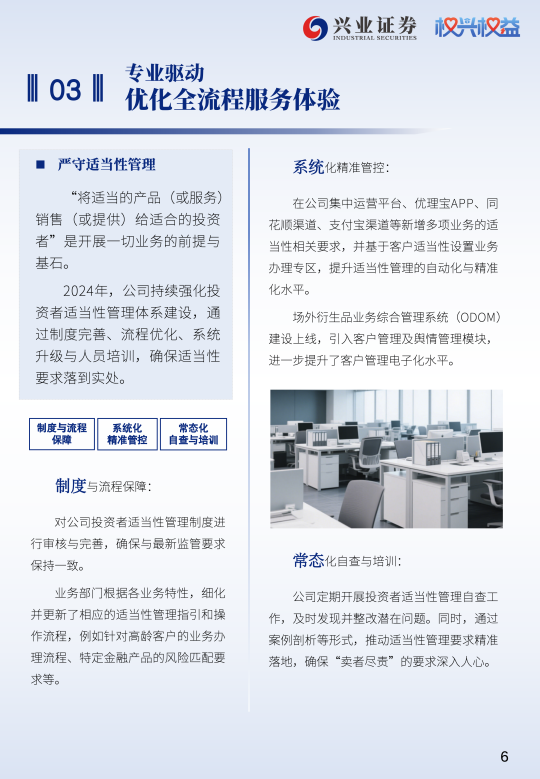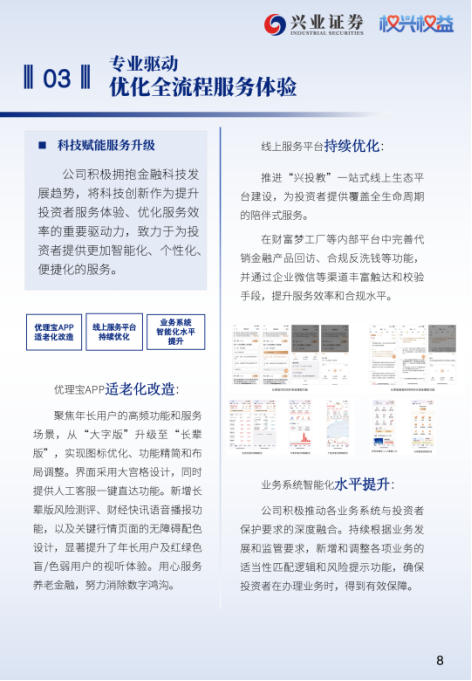 本章聚焦于兴业证券如何严守适当性管理底线、规范营销宣传与信息披露行为,并积极运用金融科技赋能服务升级,不断提升投资者在各个服务环节的体验。