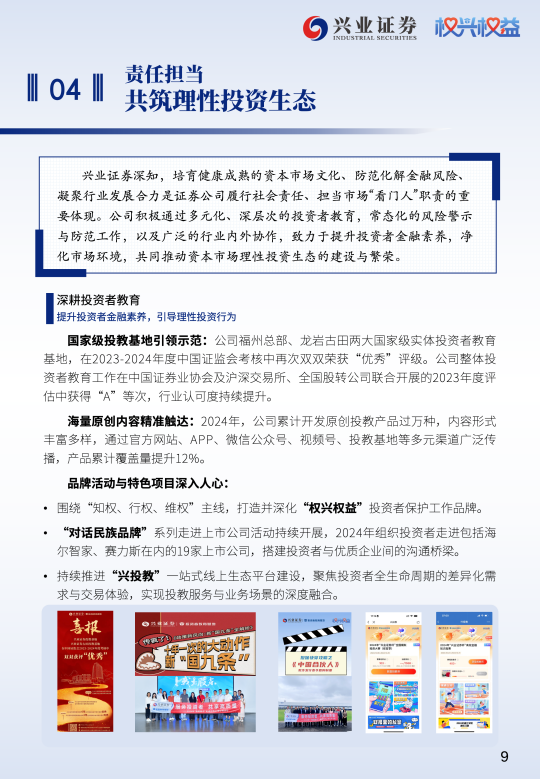 本章展现了兴业证券在深耕投资者教育、培育理性投资文化、积极防范化解金融风险、净化市场环境,以及凝聚多方合力共促行业健康发展等方面的责任与担当。
