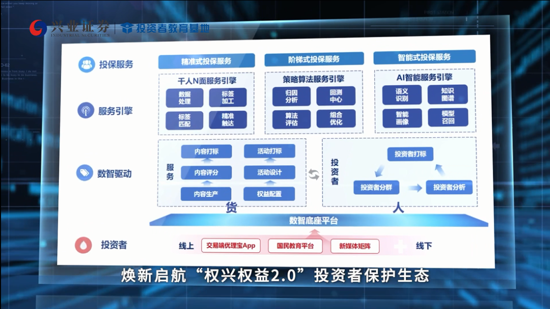 为进一步深化投资者保护内涵、提升投保服务质效、精准响应当前复杂市场环境下的投资者新需求,兴业证券在“权兴权益”1.0实践经验的基础上,洞察行业趋势,深度融合金融科技,创新服务理念,对投资者保护工作进行了全面升级与整体重塑。值此2025年“5·15全国投资者保护宣传日”到来之际,我们隆重推出——兴业证券“权兴权益2.0”投资者保护生态。