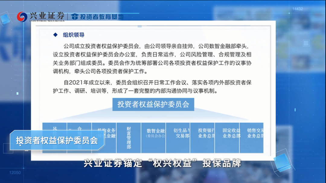 2024年3月,兴业证券推出投资者权益保护品牌——“权兴权益”,围绕“知权、行权、维权”,在帮助投资者提升风险意识、了解自身权益方面取得了积极成效。
