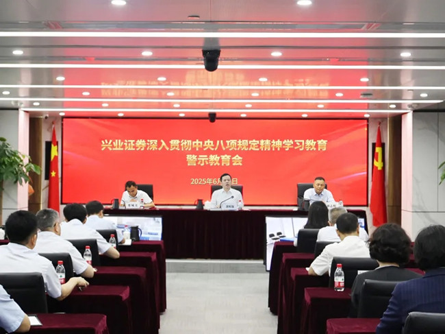 6月17日,兴业证券召开深入贯彻中央八项规定精神学习教育警示教育会,传达学习中央有关文件和全省警示教育会精神,开展反面案例警示教育,对学习教育进行部署推动。兴业证券党委书记苏军良主持会议并讲话。