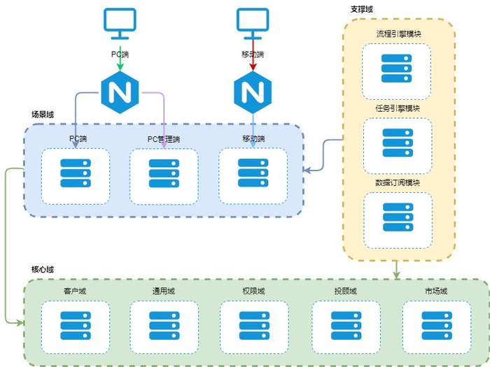 本次系统升级实践,采用了领域驱动设计(DDD)原则来指导应用架构的设计。通过这种设计,我们构建了一个分层的“3+N”领域架构,以促进业务能力的下沉和复用。系统被划分为三个主要层级:场景域、支撑域和核心域。