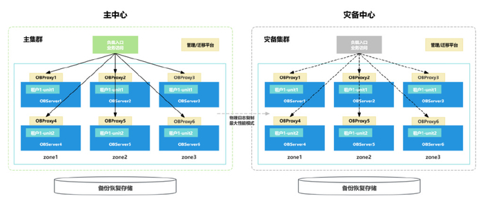 在数据库部署设计时,重点考虑通过数据库的分布式能力提升整体处理能力,满足当前业务使用;同时,考虑未来的可扩展性。在此背景下,我们选择在主中心使用三副本(3zone)、每副本2台物理节点(2-2-2)的部署架构,租户使用unit=2,primary_zone打散到3zone的配置,同时在灾备中心部署1:1全对等的环境。