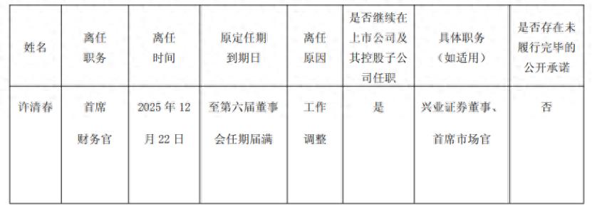 12月22日,许清春因工作调整,申请辞去兴业证券首席财务官职务。辞任后,许清春将担任公司董事、首席市场官职务。
