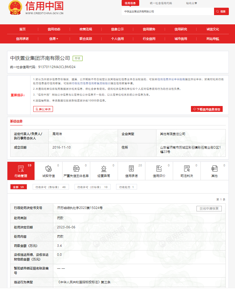 值得一提的是,今年6月6日,据信用中国官网显示,中铁置业集团济南有限公司因未按规定进入公共资源交易中心进行交易,被济南市历城区综合行政执法局处罚3.4万元。