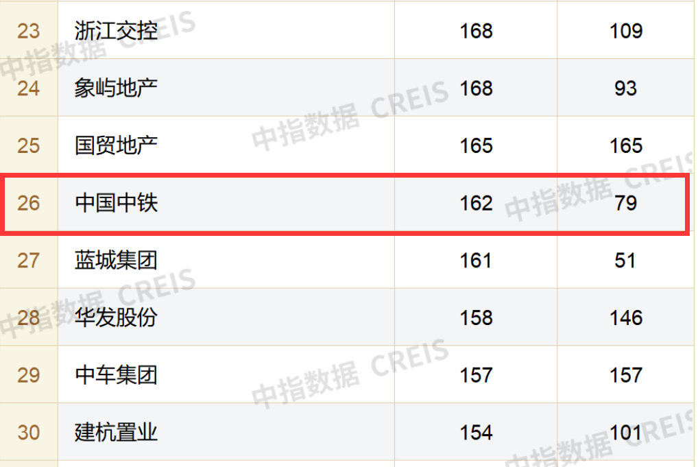 另据中指研究院数据,今年上半年,中国中铁以40亿元的权益拿地金额排在行业第38位;以162亿元的全口径新增货值排在行业第26位。