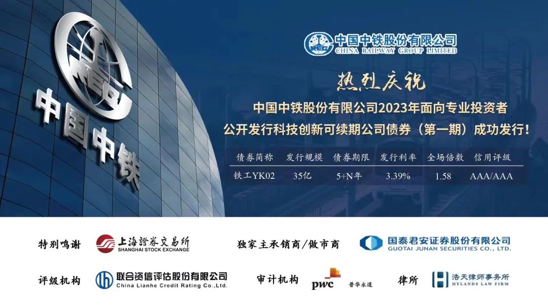 7月12日,中国中铁股份有限公司2023年面向专业投资者公开发行科技创新可续期公司债券(第一期)在上海证券交易所成功发行,本期债券发行规模为35亿元,发行期限为5+N年,票面利率为3.39%。国泰君安担任本期债券的独家主承销商、做市商。