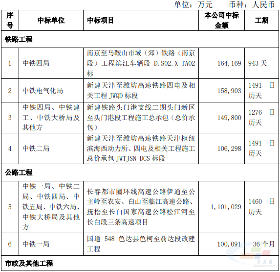 公告中显示,共有4个铁路工程,2个公路工程,21个市政及其他工程,1个海外工程,合计项目金额587.9亿元。