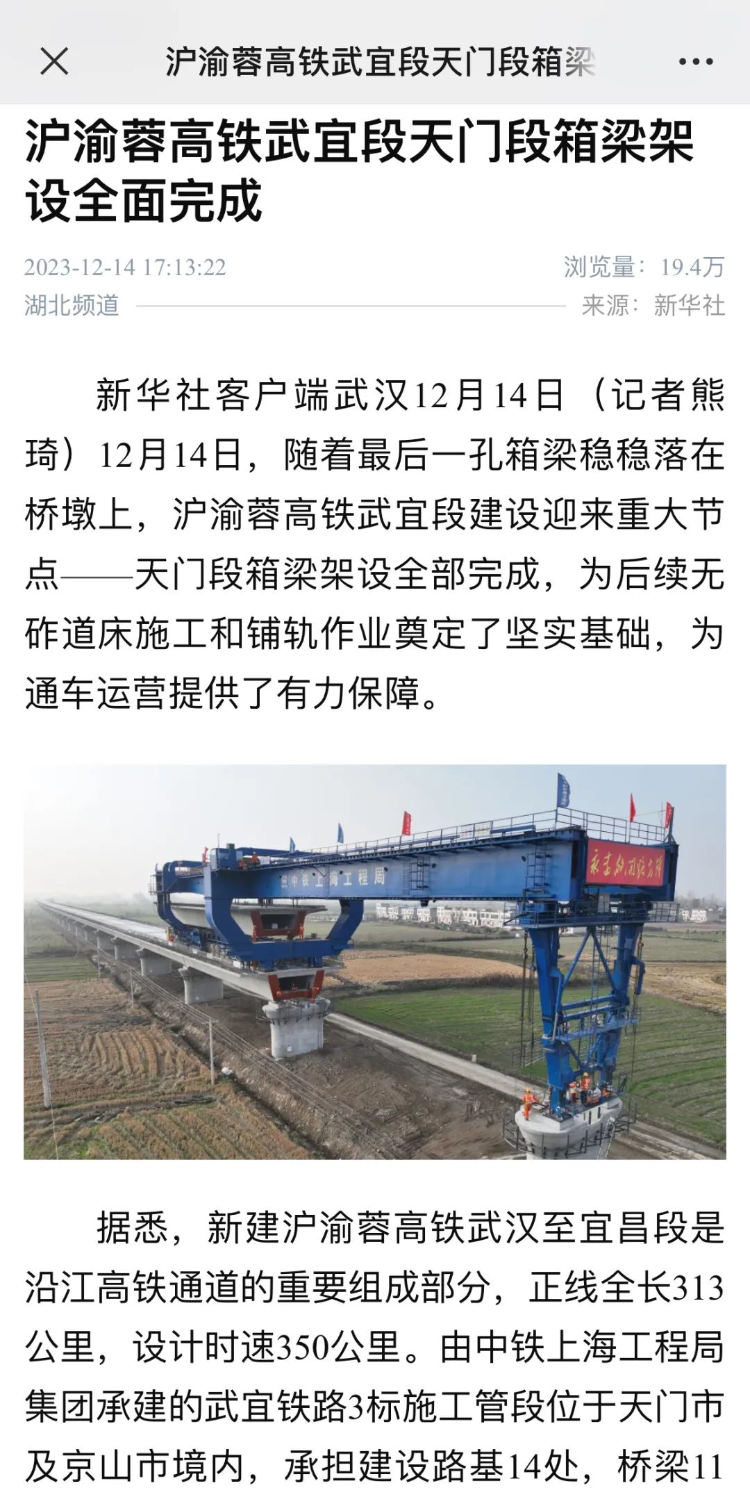 新华社:沪渝蓉高铁武宜段天门段箱梁架设全面完成