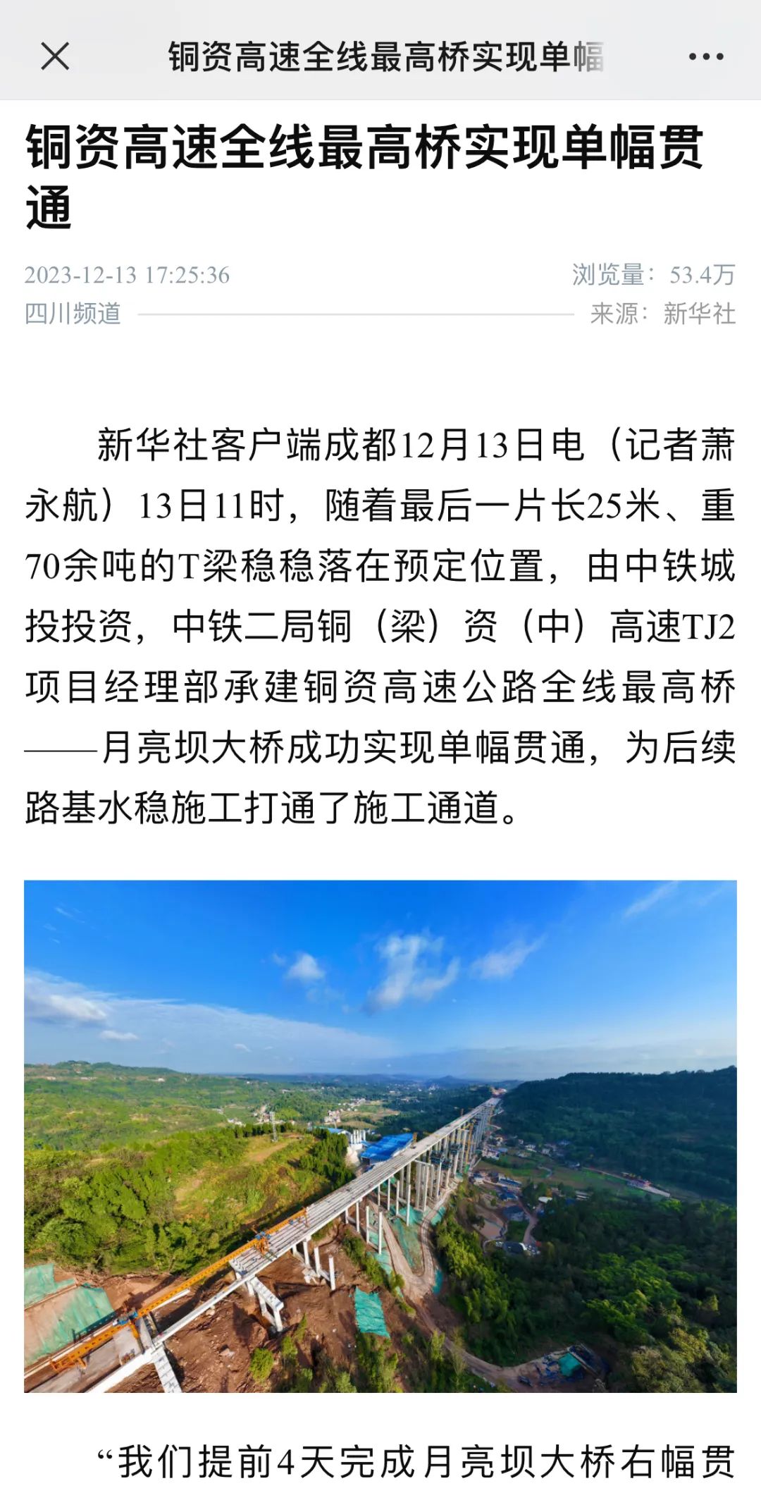 内容简介:12月13日,由中铁城投投资、中铁二局铜(梁)资(中)高速TJ2项目经理部承建的铜资高速公路全线最高桥——月亮坝大桥成功实现单幅贯通,为后续路基水稳作业打通了施工通道。