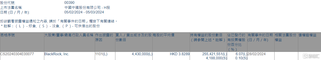 格隆汇3月5日丨根据联交所最新权益披露资料显示,2024年2月28日,中国中铁(00390.HK)获BlackRock, Inc.在场内以每股均价3.8289港元增持好仓443万股,涉资约1696.2万港元。
