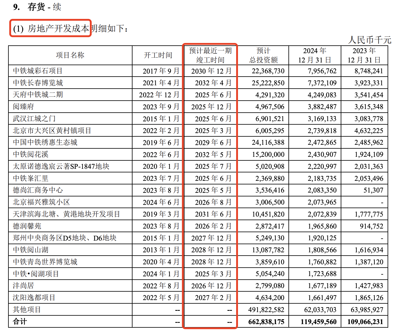 合并财务报表显示,截至2024年末,中国中铁存货账面余额总计2521.79亿元。其中: