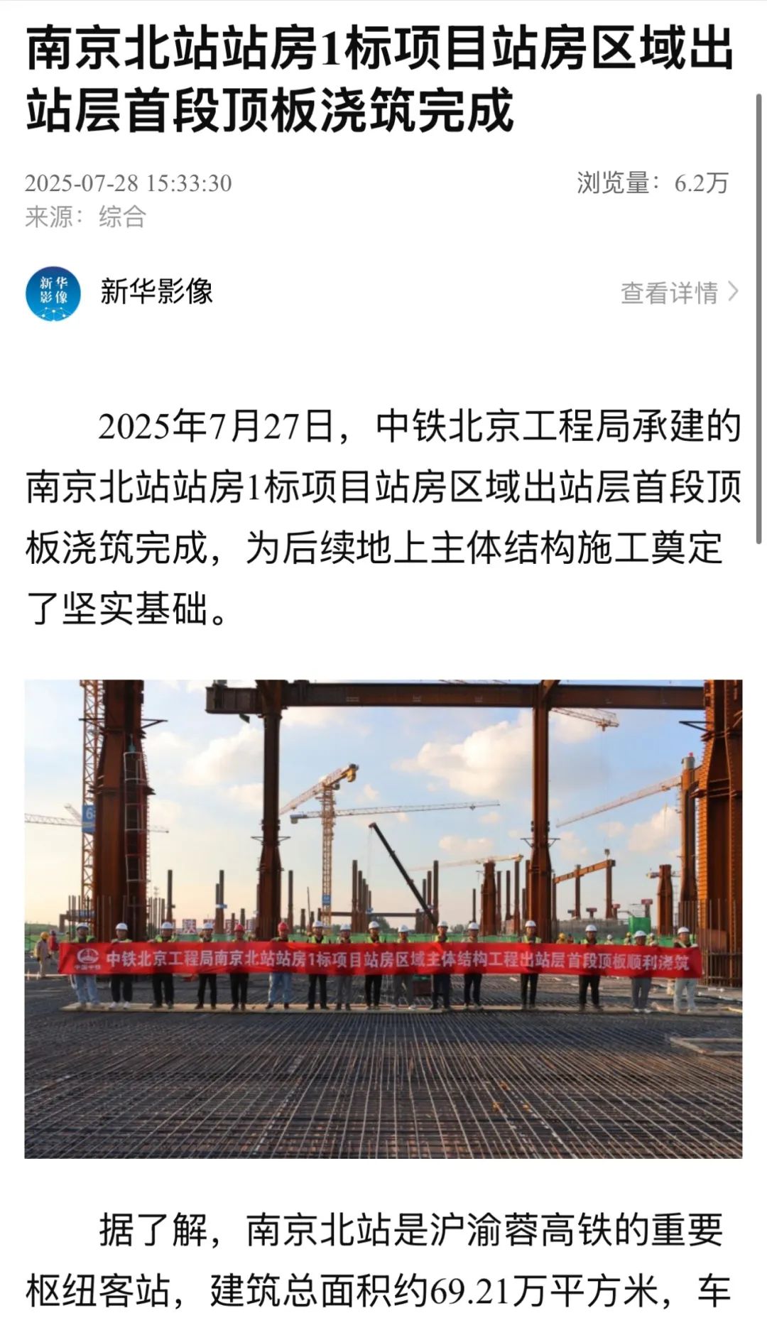 南京北站站房1标项目站房区域出站层首段顶板浇筑完成