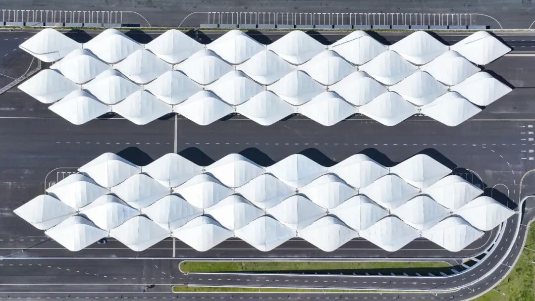项目设计融合生态与科技,整体以“白浪平沙”为理念,首层设计结合骑楼建筑形式,突出强烈的秩序感与光影变化,二层膜结构图形来自海口市花三角梅,遮风挡雨美观实用。
