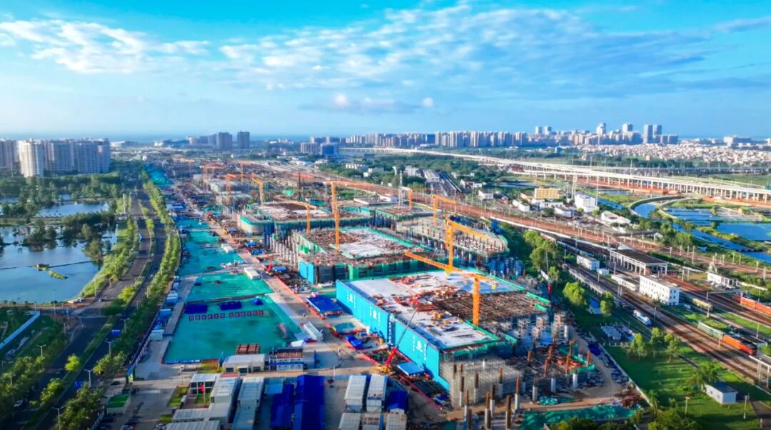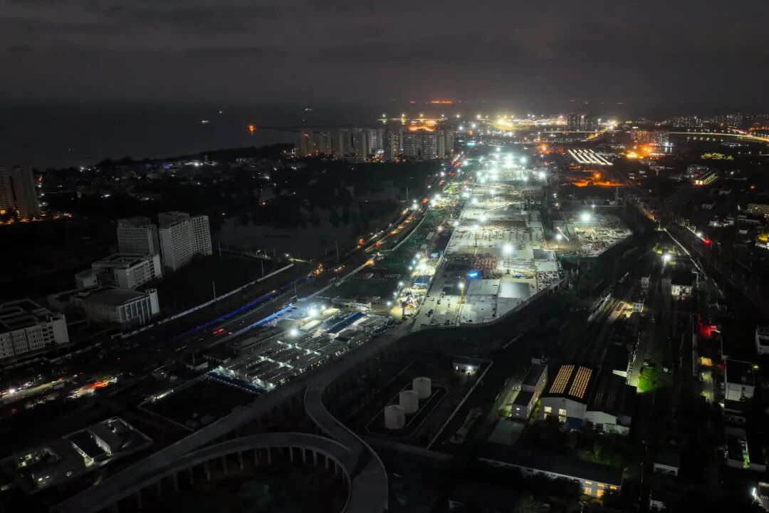 但从一片泥泞鱼塘到全面竣工,项目有效工期仅有420天。这意味着在2.4公里长的狭长地带上,土建、钢结构、幕墙、机电、消防等数十个专业工种必须同步展开、交叉作业、无缝衔接。叠加海南地区高温、多雨、台风频繁的恶劣气候,项目必须保持“全天候、高强度”的施工节奏,每一步都是“极限冲刺”。