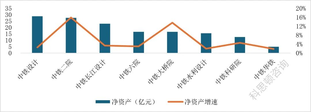 净资产规模方面,中铁设计、中铁二院、中铁长江设计净资产规模位列前三,分别为28.9亿元、27.5亿元、23.1亿元;中铁六院、中铁大桥院、中铁水利设计、中铁科研院净资产规模位于第二梯队,在10-20亿之间;中铁华铁净资产规模最低,仅为5亿元。