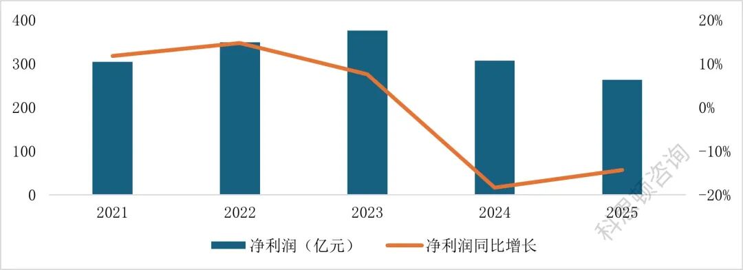 净利润方面,中国中铁2021-2023年净利润逐年增长,2024-2025年连续两年下降。2025年中国中铁实现净利润263.6亿元,同比下降14.3%,利润下降主要受营业收入减少和部分业务毛利率下降的影响。