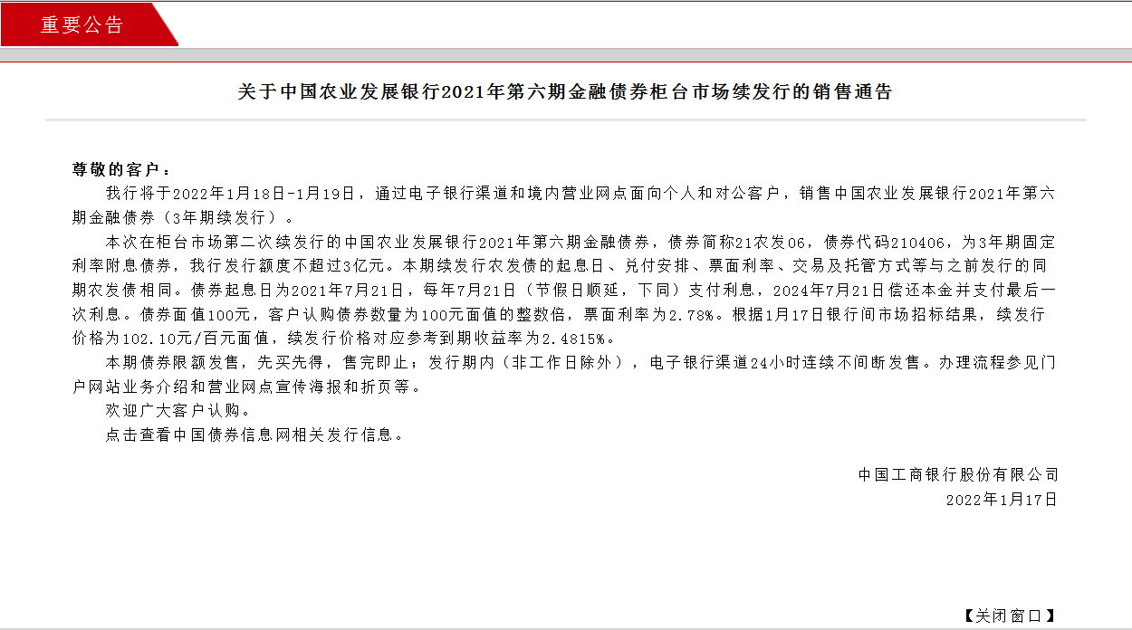 1月17日,中国工商银行官网发布公告称,将于2022年1月18日-1月19日,销售中国农业发展银行2021年第六期金融债券(3年期续发行)。
