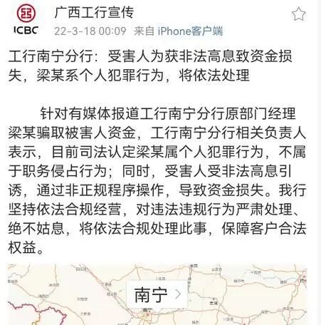 3月18日,工行南宁分行在微博公开回应表示,此案受害人为获非法高息致资金损失,梁某系个人犯罪行为,将依法处理。