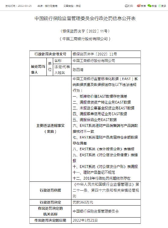 3月25日消息,中国工商银行监管标准化数据(EAST)系统数据质量及数据报送存在以下违法违规行为,被银保监会罚款360万元: