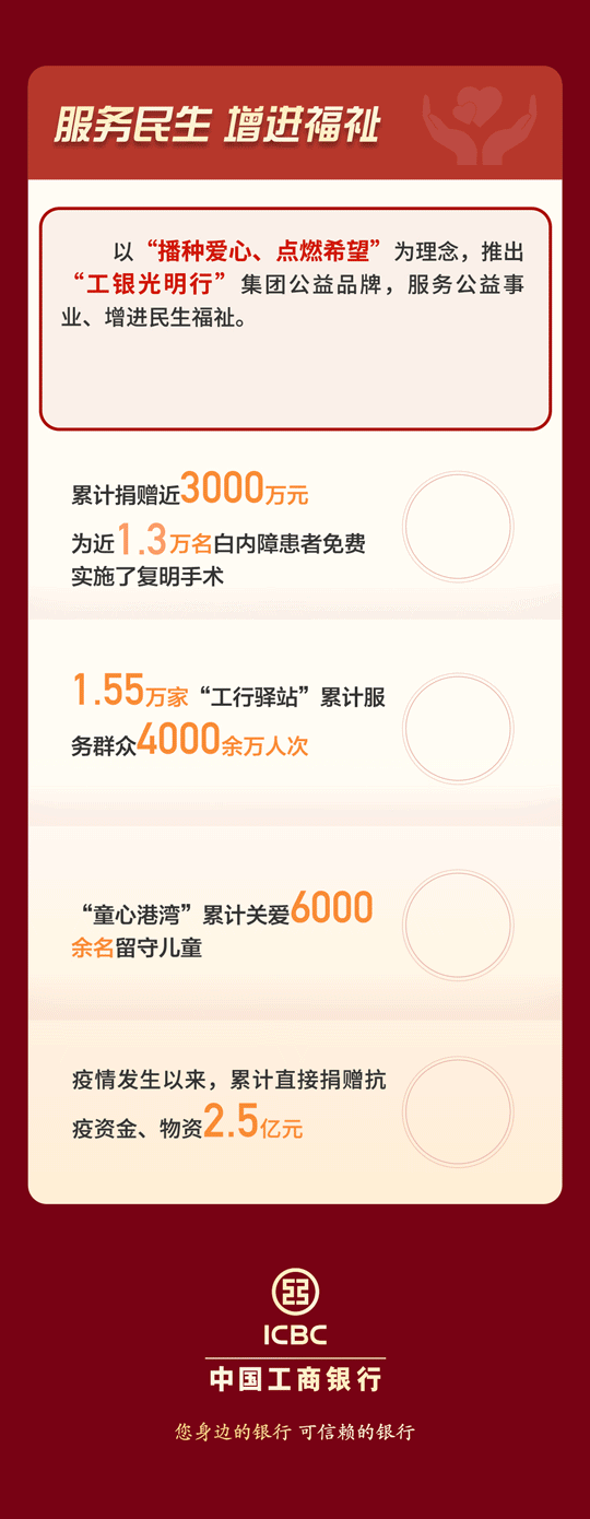 2021年,工商银行正式推出集团公益品牌“工银光明行”,直面人民群众“急难愁盼”问题,推进建立长效公益机制。目前,已涵盖免费诊疗、农村留守儿童关爱、助学助教等领域。其中,“健康快车”项目为贫困地区白内障患者提供免费治疗,已累计捐赠近3000万元,先后为近1.3万名白内障患者免费实施了复明手术。此外,工商银行还依托1.55万家“工行驿站”,向户外工作者及社会公众,提供“歇歇脚、充充电、挡挡雨”等多项公益惠民暖心服务,累计服务群众4000余万人次。