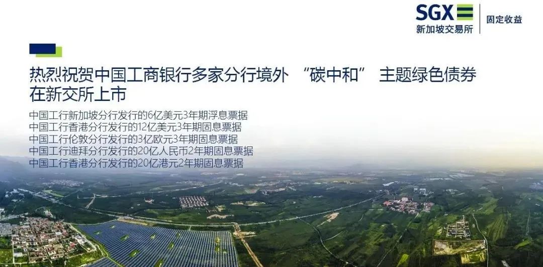 新加坡交易所热烈祝贺中国工商银行发行的全球多币种“碳中和”主题境外绿色债券成功上市。本次发行涵盖美元、欧元、港币和离岸人民币四个币种、五只债券,最终发行规模等值26.8亿美元。