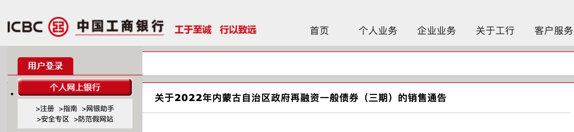 中国工商银行6月22日发布公告:我行将于2022年6月23日、6月24日、6月27日,通过电子银行渠道和境内营业网点面向个人和对公客户,销售2022年内蒙古自治区政府再融资一般债券(三期)。