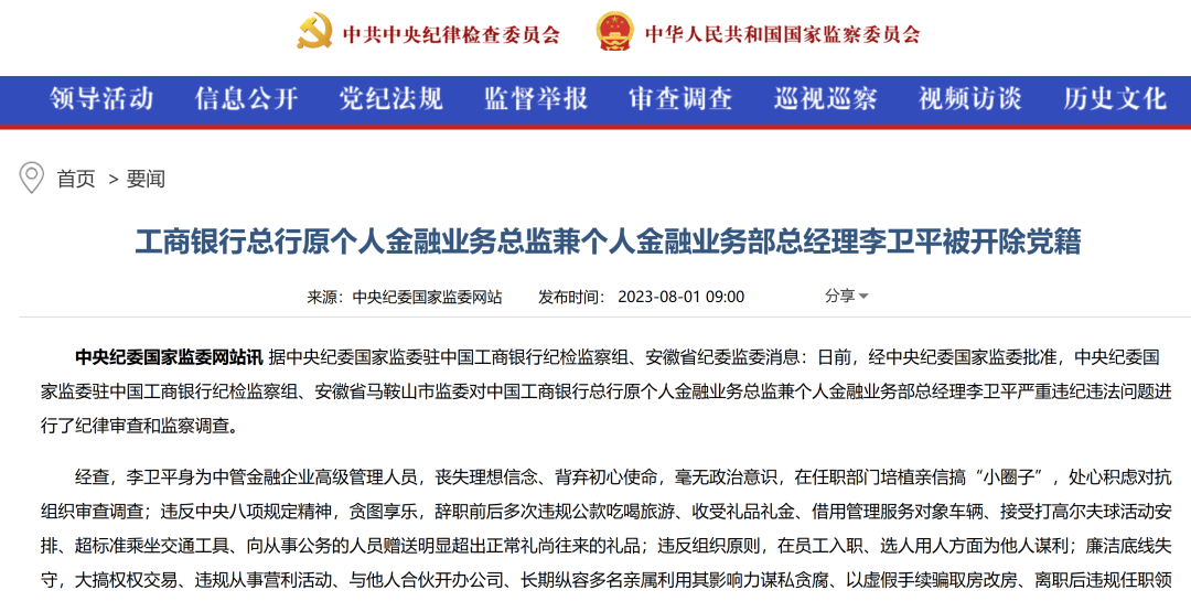 8月1日,中央纪委国家监委驻中国工商银行纪检监察组、安徽省纪委监委消息,李卫平被开除党籍。