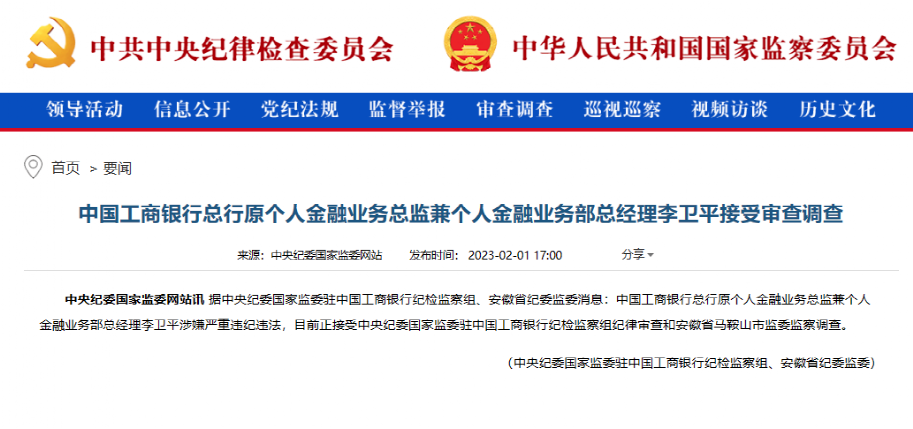 直至今年2月被查。中央纪委国家监委网站消息显示,中国工商银行总行原个人金融业务总监兼个人金融业务部总经理李卫平涉嫌严重违纪违法,接受审查调查。