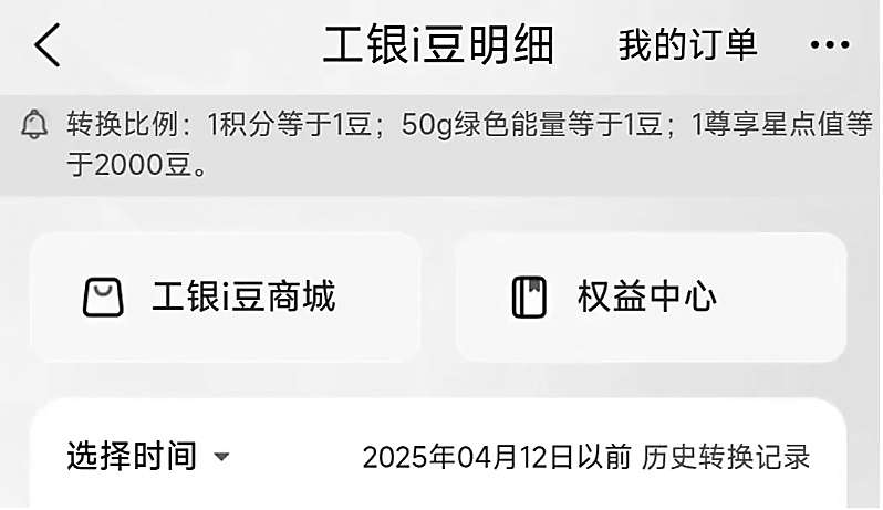 记者调查发现,4月8日,工行官网发布了“关于全面整合个人客户增值服务回馈形式并全新推出‘工银i豆’的通告”。通告称,自2025年4月13日起全面整合该行积分(含消费积分和特定积分)、尊享星点值、绿色能量和私享权益等各类个人客户增值服务回馈形式,同步全新推出统一的个人客户增值服务回馈形式“工银i豆”,各类来源“工银i豆”可统一累积后在“工银i豆”商城兑换商品和服务。根据通告,转换规则为:1积分或者50绿色能量等于1豆,1星点值等于2000豆。