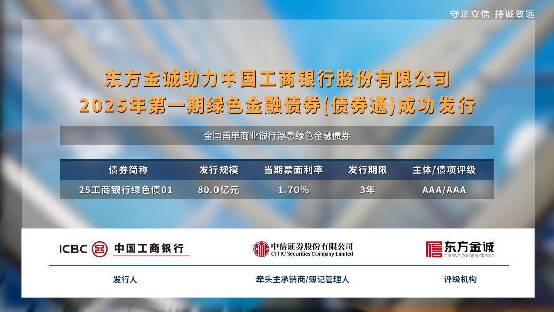 近日,由东方金诚评级的“中国工商银行股份有限公司2025年第一期绿色金融债券(债券通)”(以下简称“本期债券”)在银行间债券市场成功发行。本期债券发行规模80亿元,发行期限3年,当期票面利率1.70%。